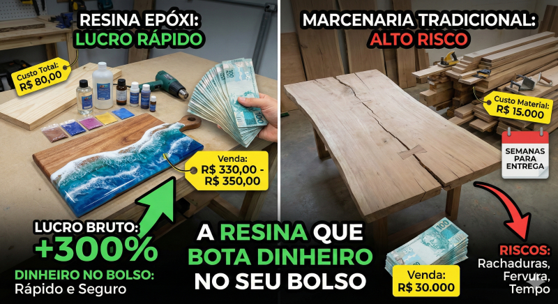 Análise de Margem: Estamos falando de um lucro bruto de mais de 300% sobre o custo de produção. Compare isso com o marceneiro que faz mesas de 30 mil reais: ele gasta 15 mil só de material, corre riscos imensos de a peça rachar ou ferver, e leva semanas para entregar. Quem realmente coloca dinheiro no bolso com rapidez e segurança? Você.