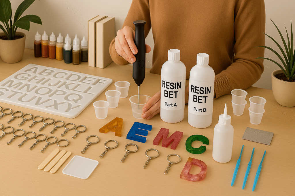 Esses kits geralmente incluem resina, moldes de silicone, pigmentos, glitter, argolas e outros acessórios essenciais para transformar uma peça em um chaveiro de verdade.